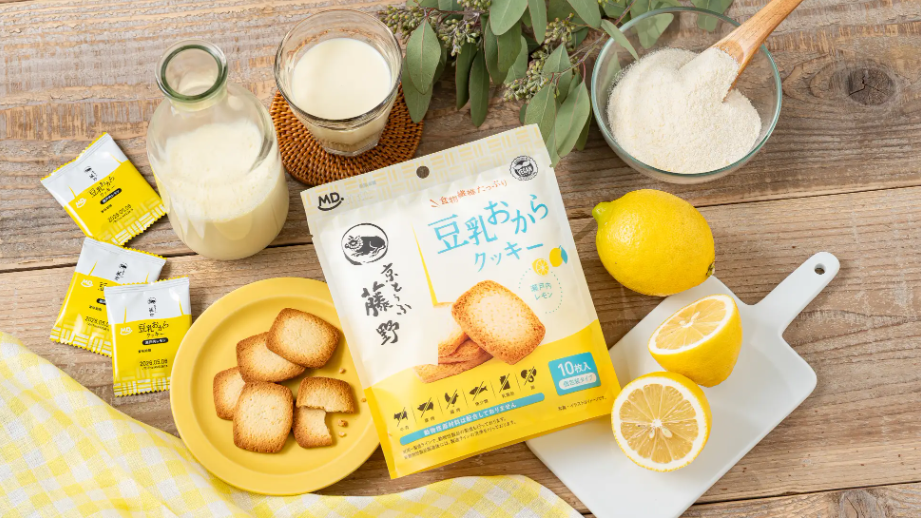 京都の豆腐屋「京とうふ藤野」との共同開発である「豆乳おからクッキー」シリーズの新商品。「京とうふ藤野」の製造工程で副産物として生まれるおからと、湯葉のくみ上げで残った豆乳を活用し、環境に配慮しながら、素材のやさしい味わいが美味しく楽しめるクッキー。瀬戸内レモンのペーストを生地に練りこみ、豆乳とおからのまろやかで素朴な味わいに、爽やかな香りとほどよい酸味を楽しめる。