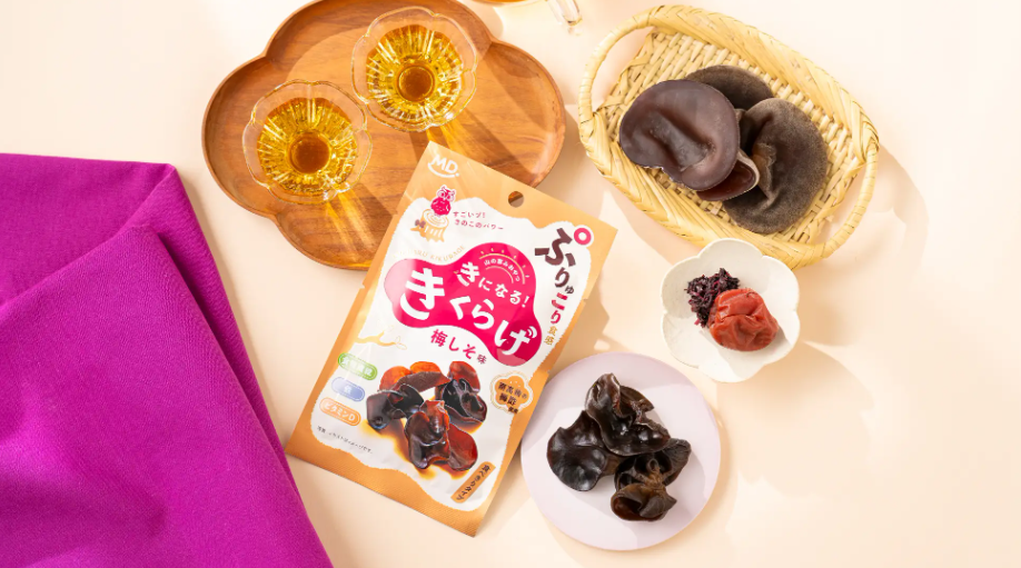 南高梅の梅酢を使用して、じっくり漬け込んだきくらげを、ひとくちサイズに仕上げた素材菓子。1袋当り12.4kcalとヘルシーで、低脂質ながらも食物繊維やビタミンD、鉄、カルシウムなど、女性に不足しがちな栄養素を摂取できる。