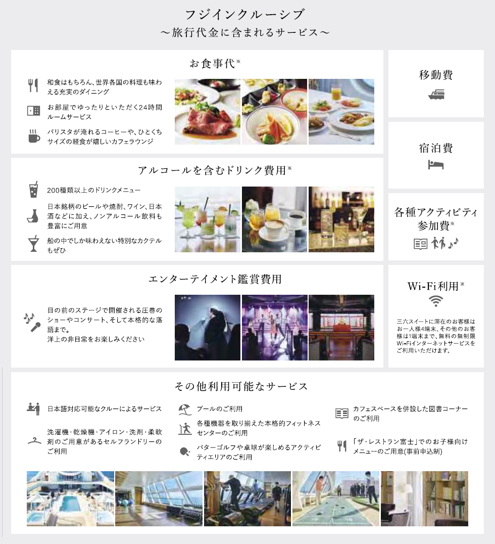 食事代やアルコールを含む飲料、寄港地観光ツアー、船内Wi-Fiは旅行代金に含まれる。《詳細》