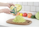 ののじの大ヒット商品「キャベピィMAX」。特許取得のステンレス製2枚刃構造により、単刃ピーラーの約2倍のスピード(当社比)でキャベツの千切りができます。高精密三角刃が繊維に沿って切り込むため、細胞を壊さず“ふわふわ”“シャキシャキ”の食感に仕上がるのが特長。まな板や包丁を使わず手軽に大量の千切りキャベツが作れ、サラダや付け合わせなど毎日の料理に便利。軽い力で引くだけの簡単操作で、時短調理にも役立ちます。