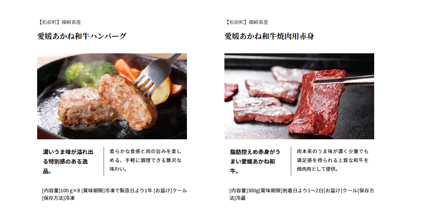 あかね和牛ハンバーグや旬のかんきつなど、約40種の愛媛県産品から好みの1品を選べる。